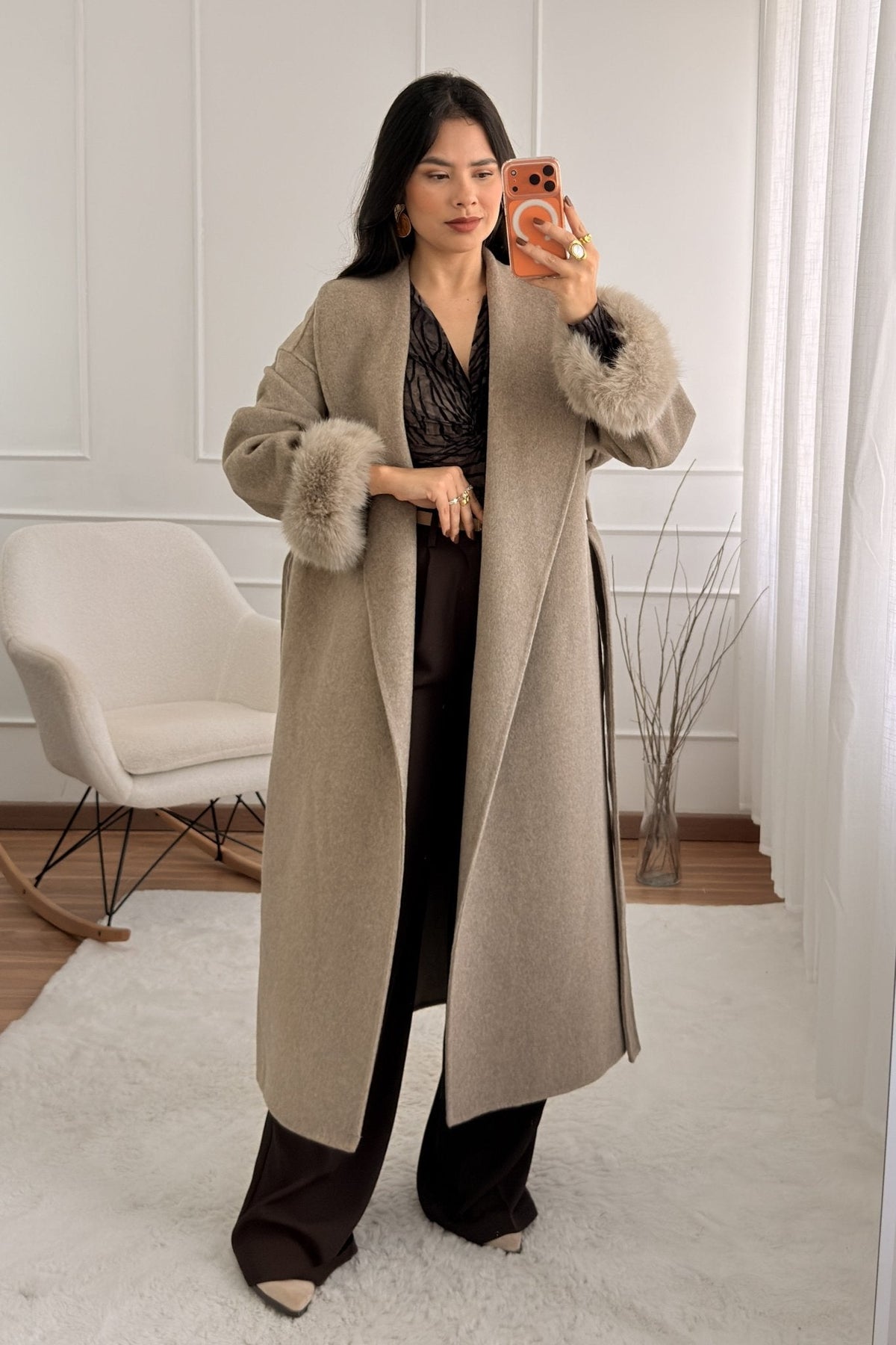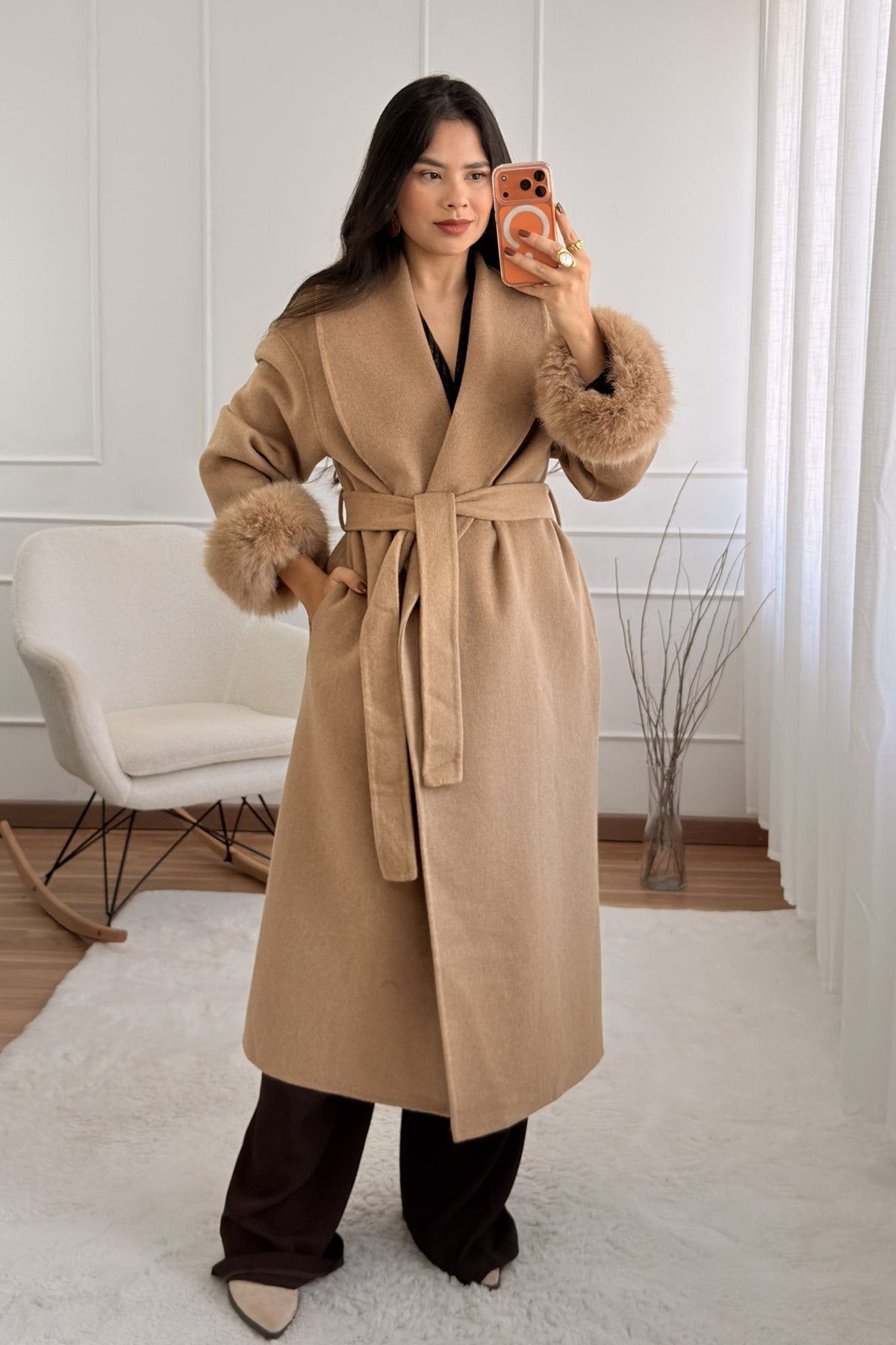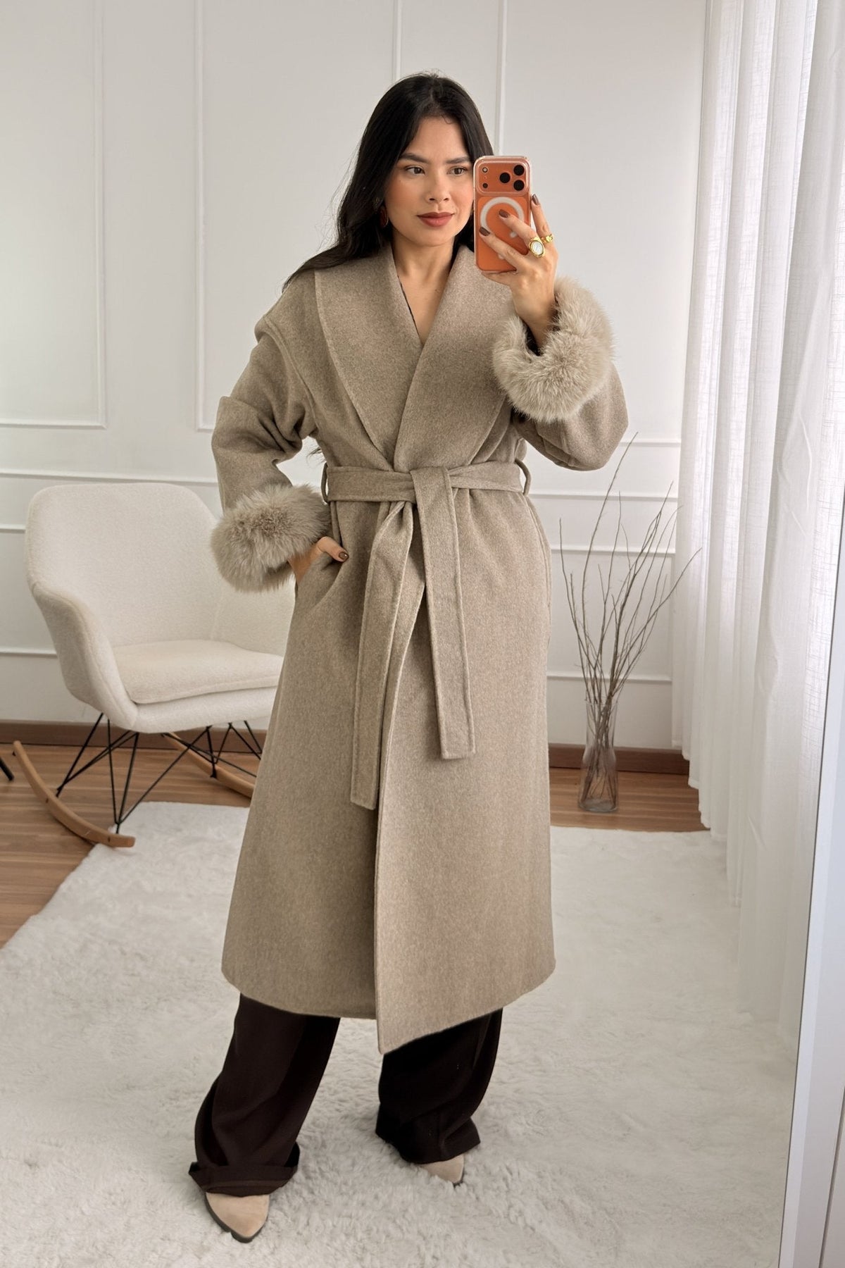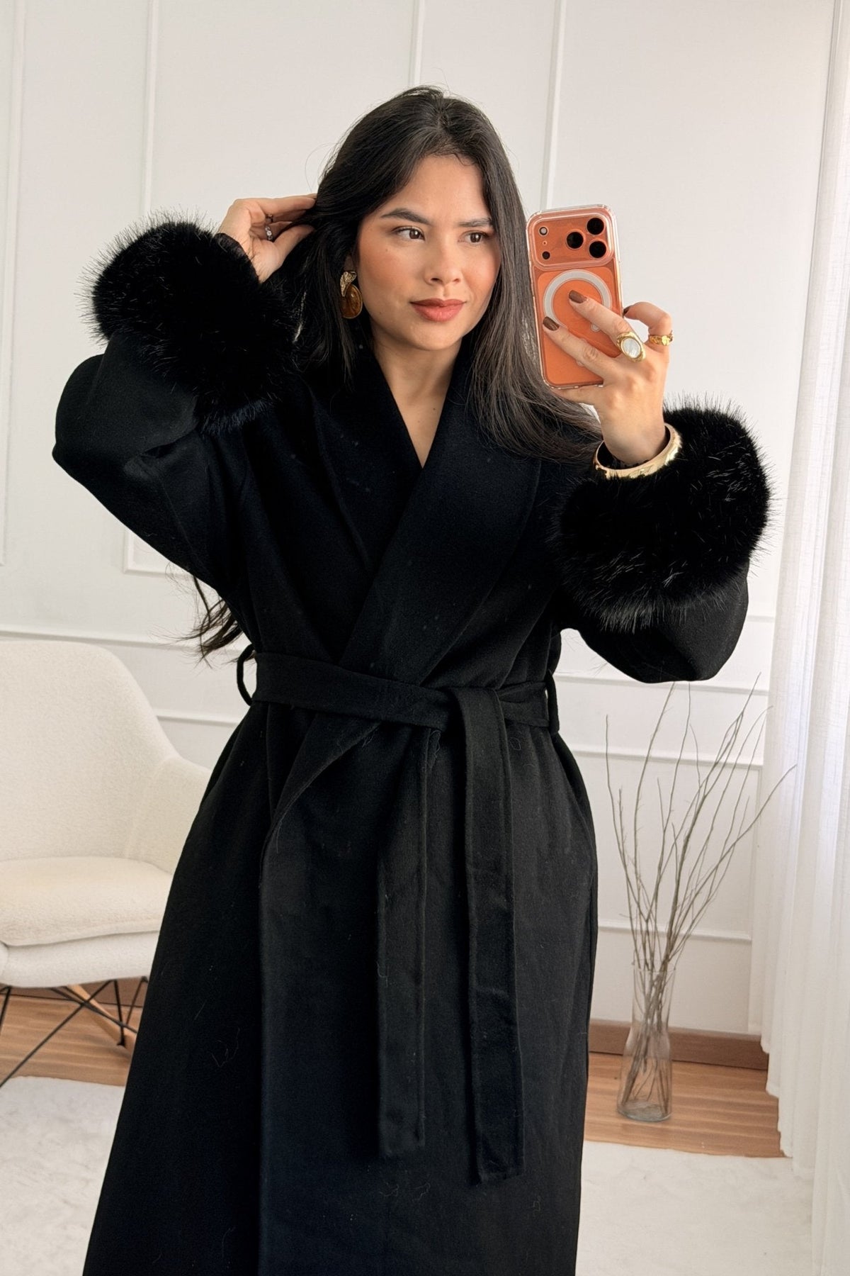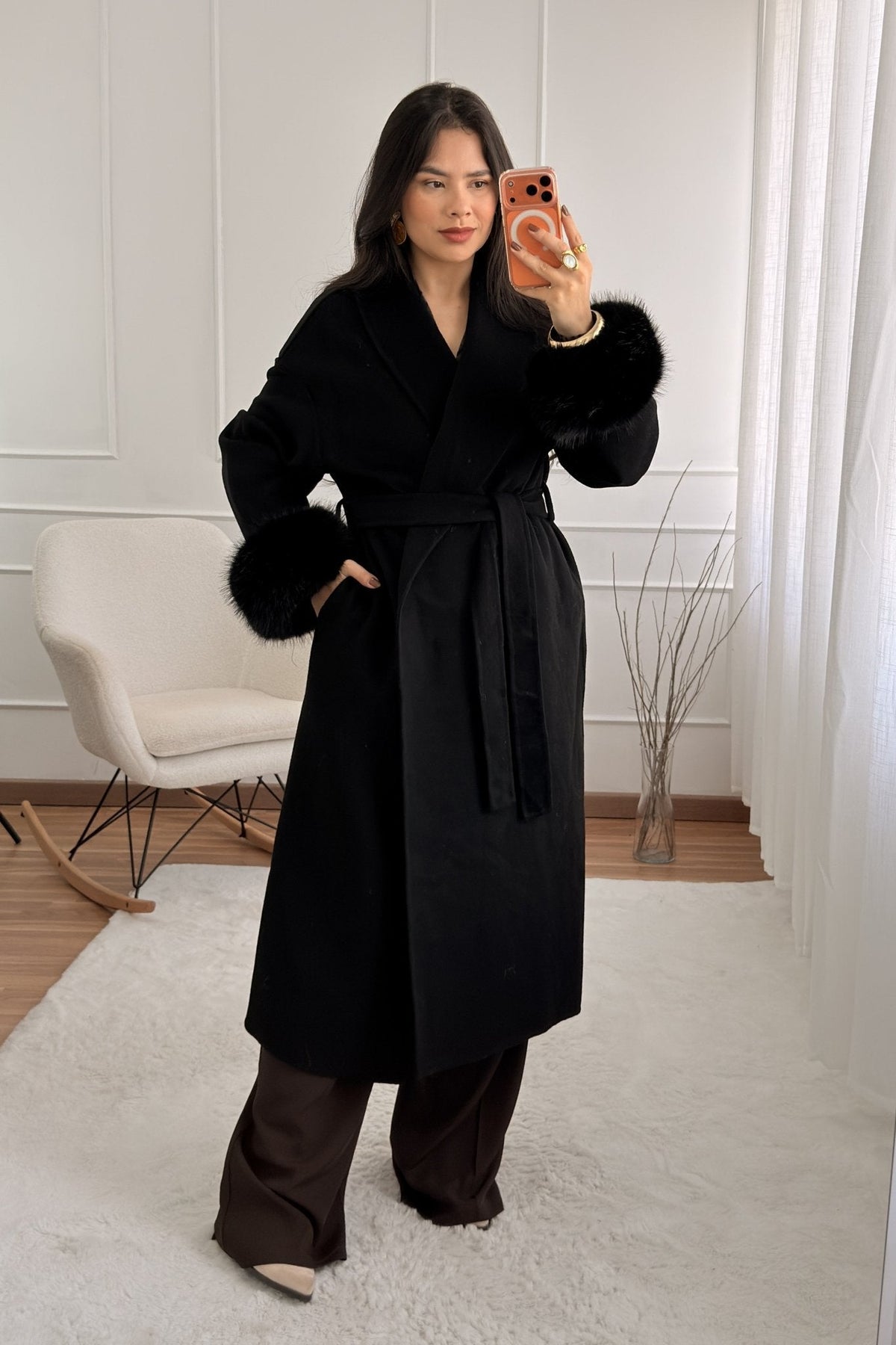 Vlněný kabát s dlouhými chlupatými manžetami