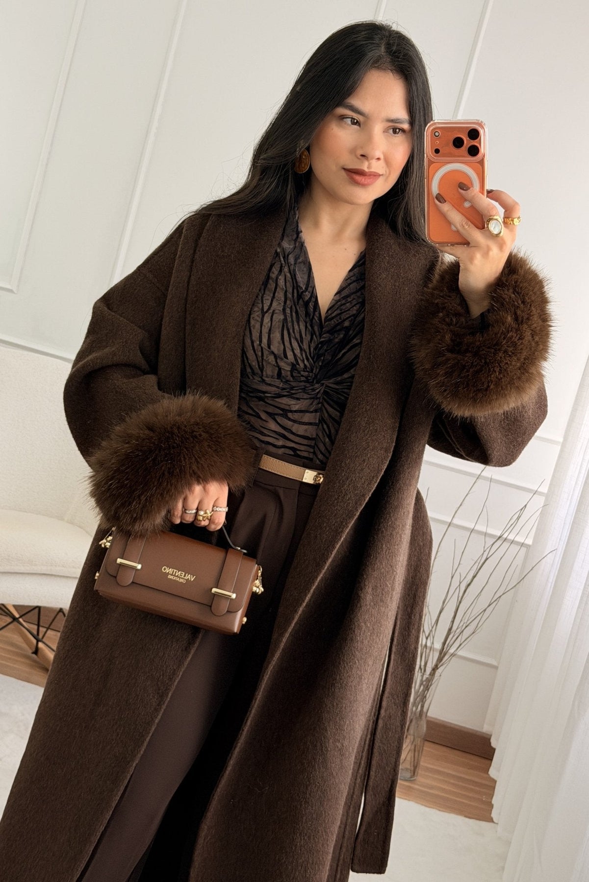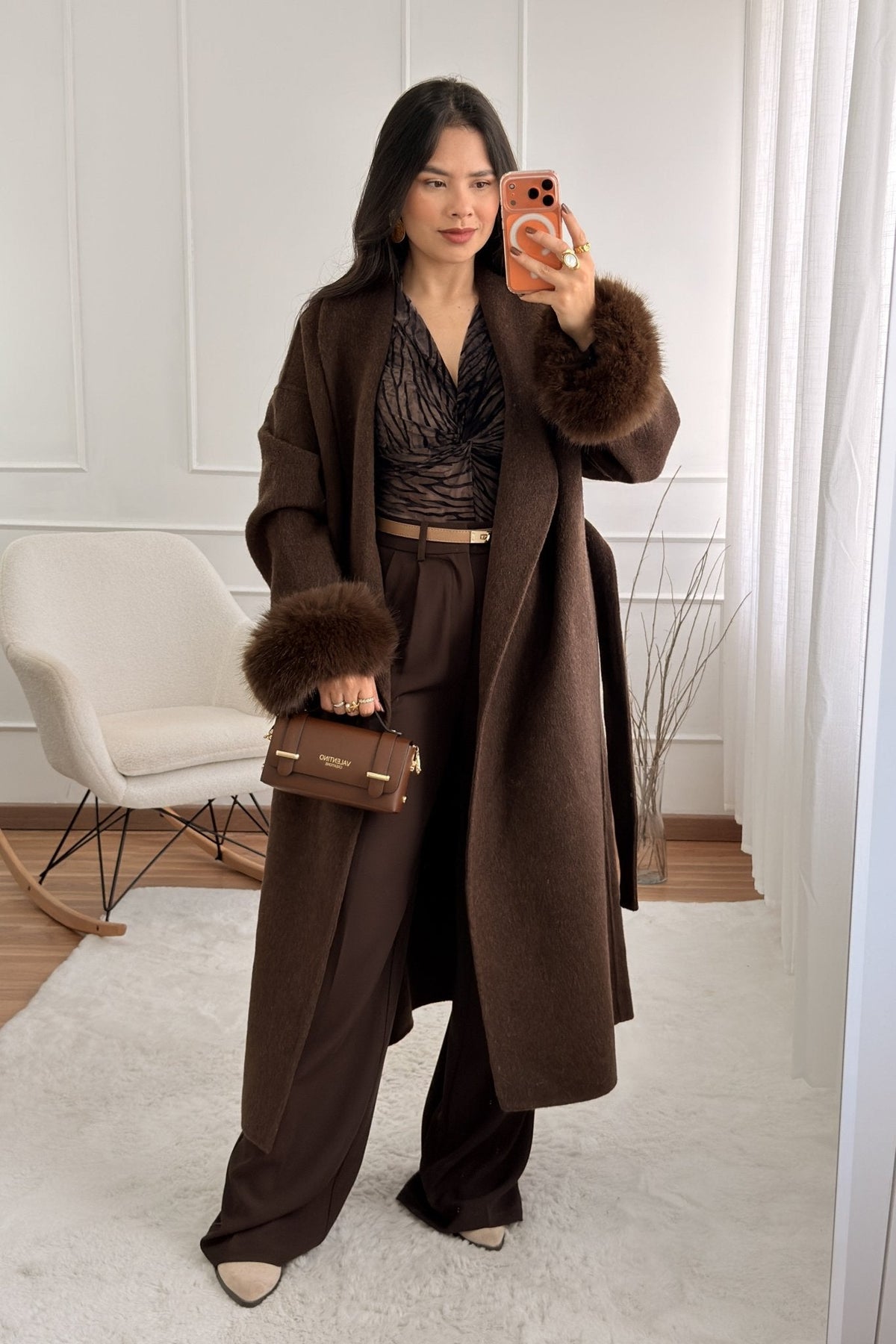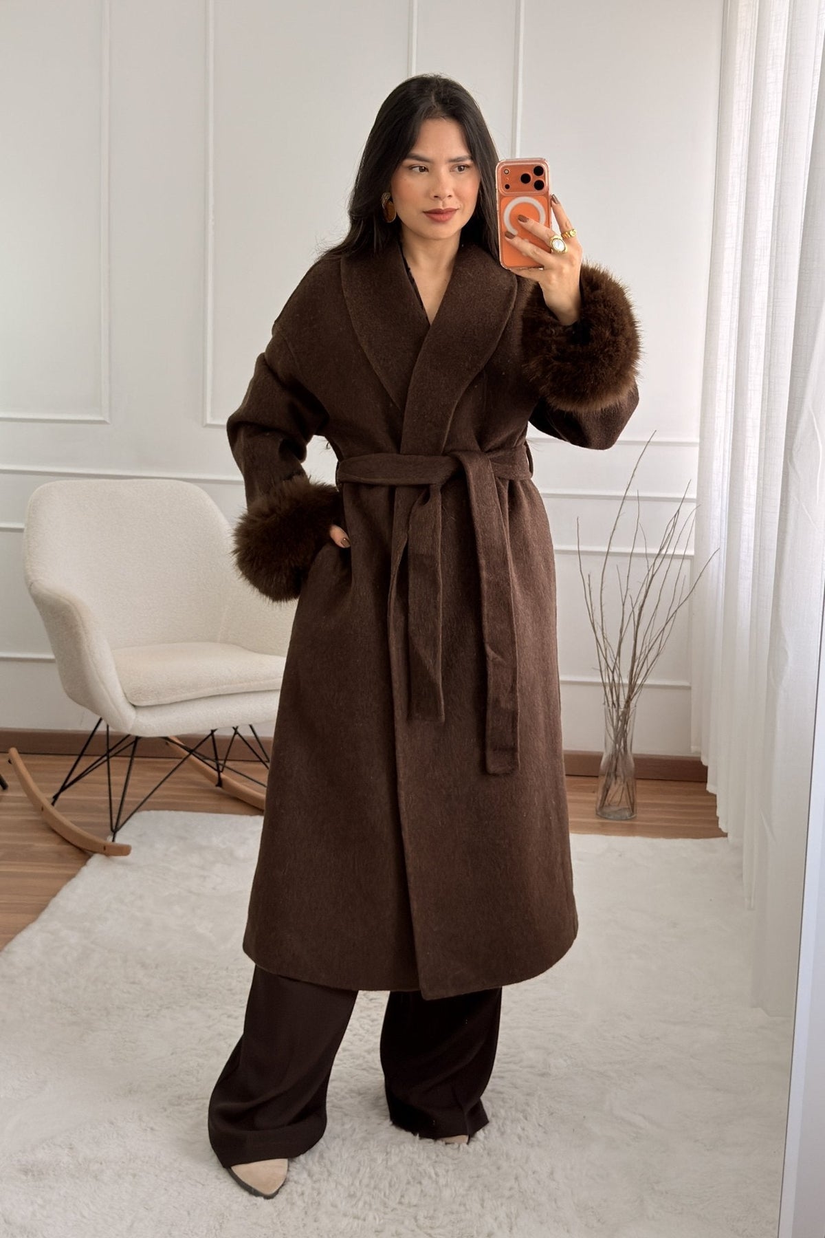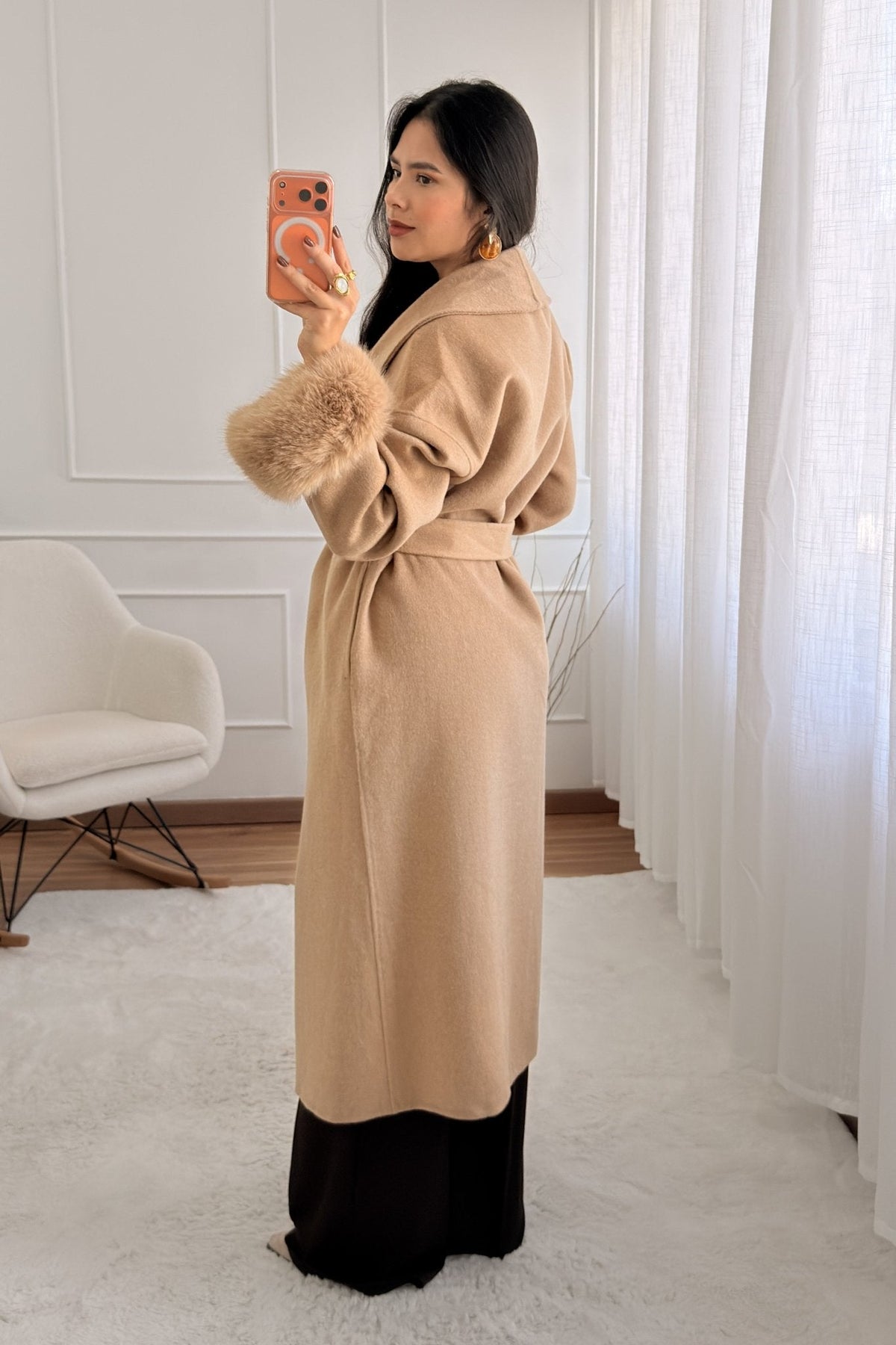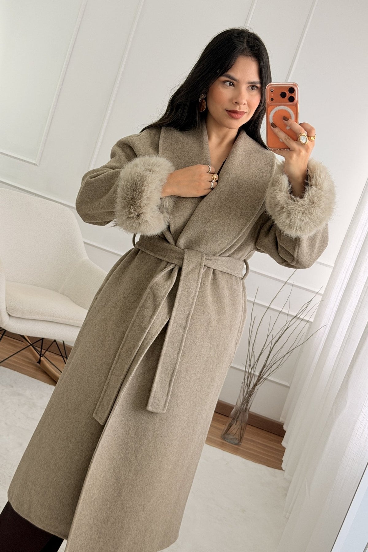 Vlněný kabát s dlouhými chlupatými manžetami