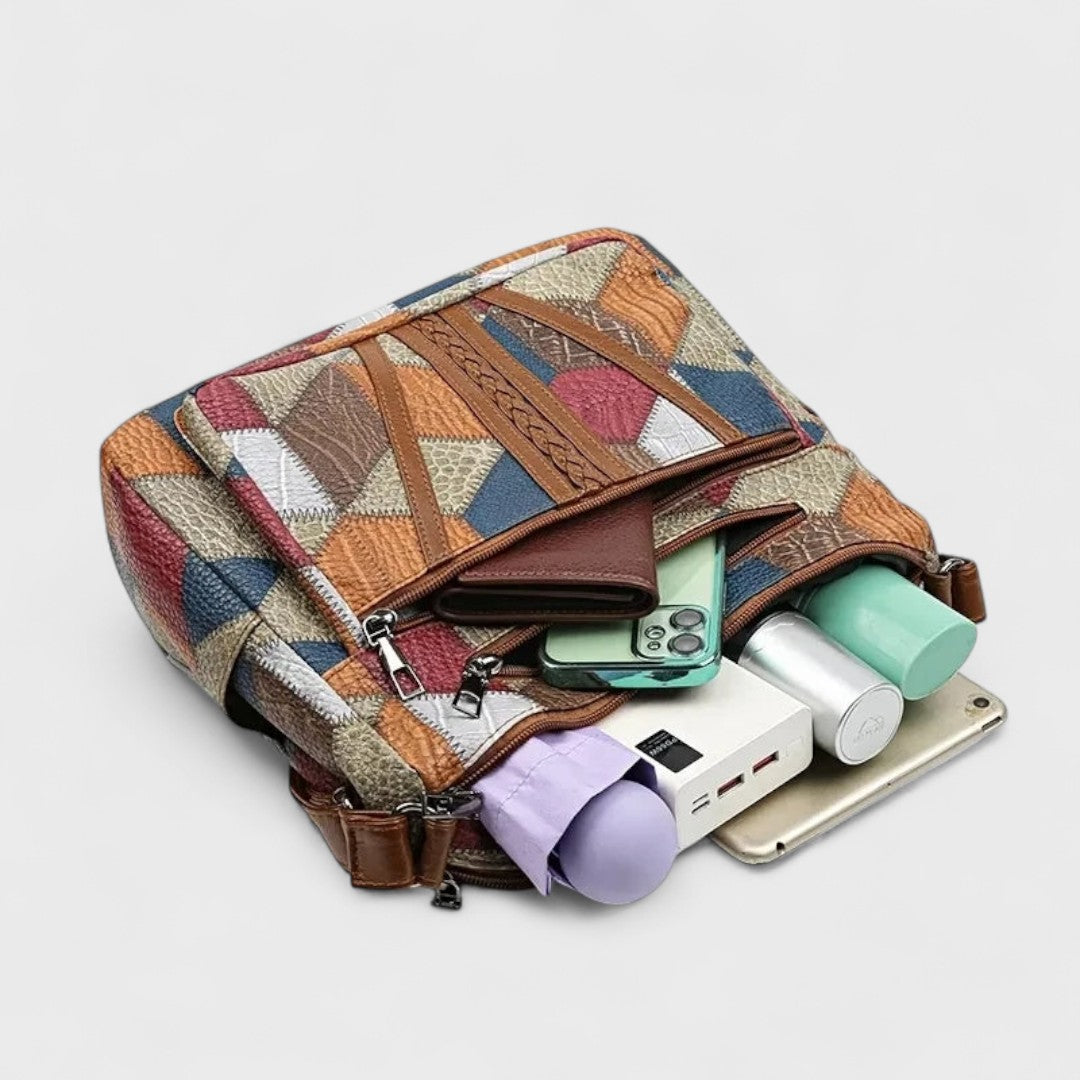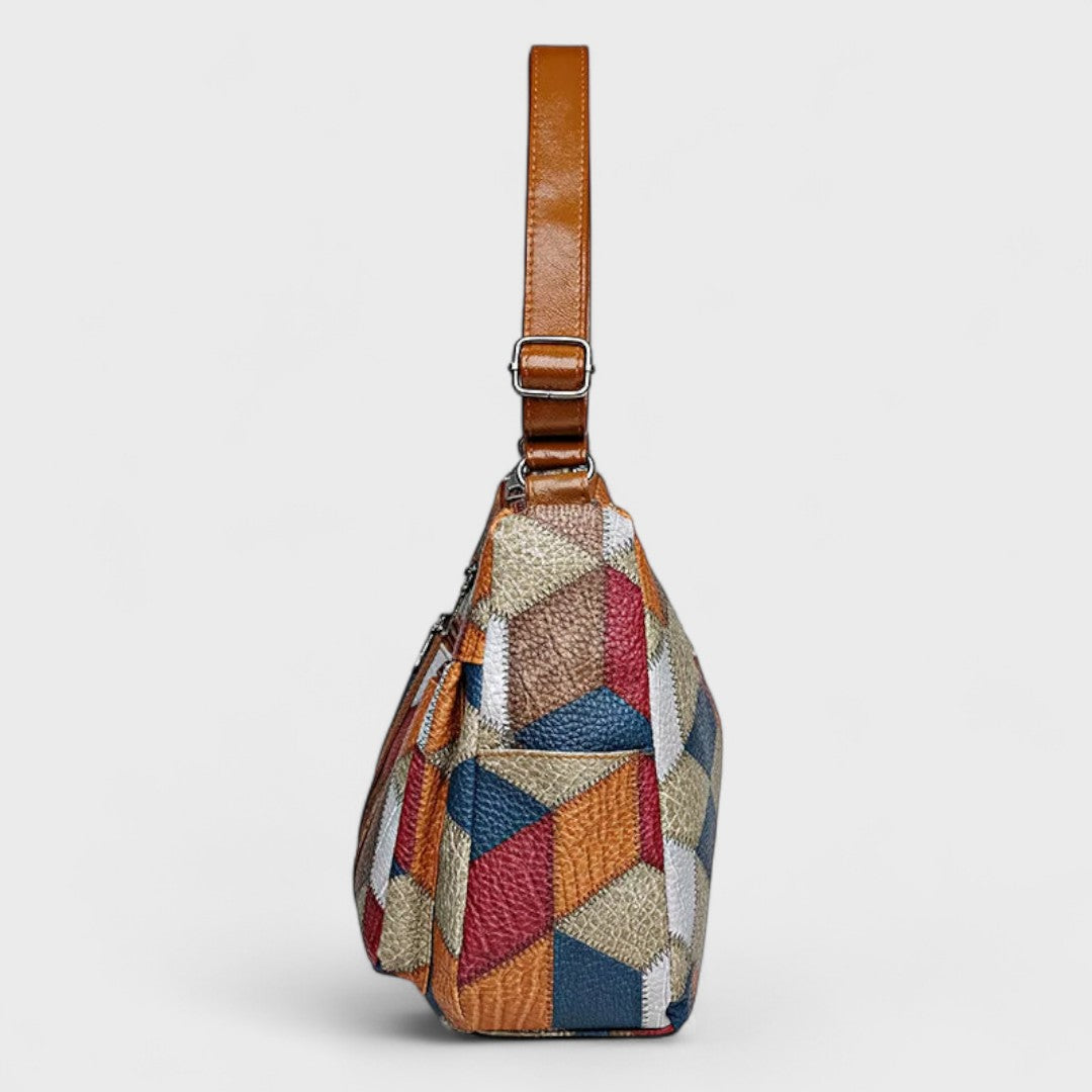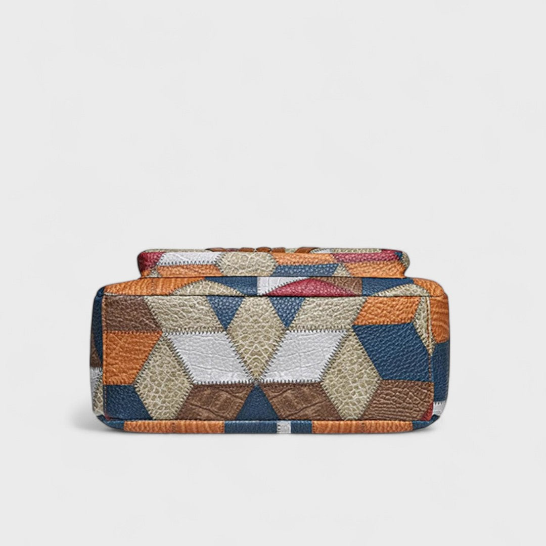 Se svým bohatým geometrickým patchworkem, elegantními koženými akcenty a prostornými kapsami, tato taška kombinuje rafinovaný styl a praktickou funkčnost, což umožňuje snadné uloženby všehních každodon.