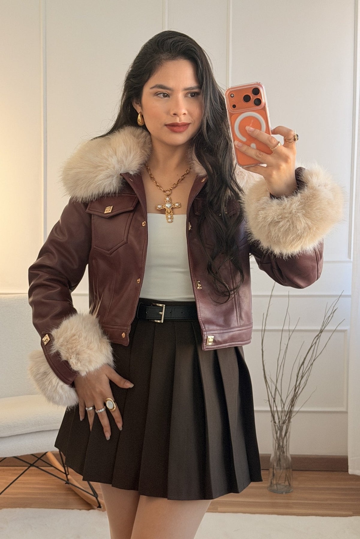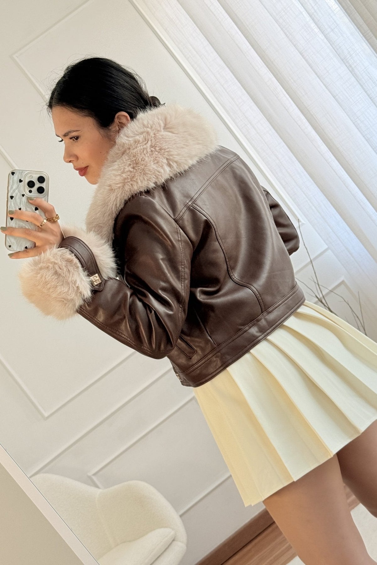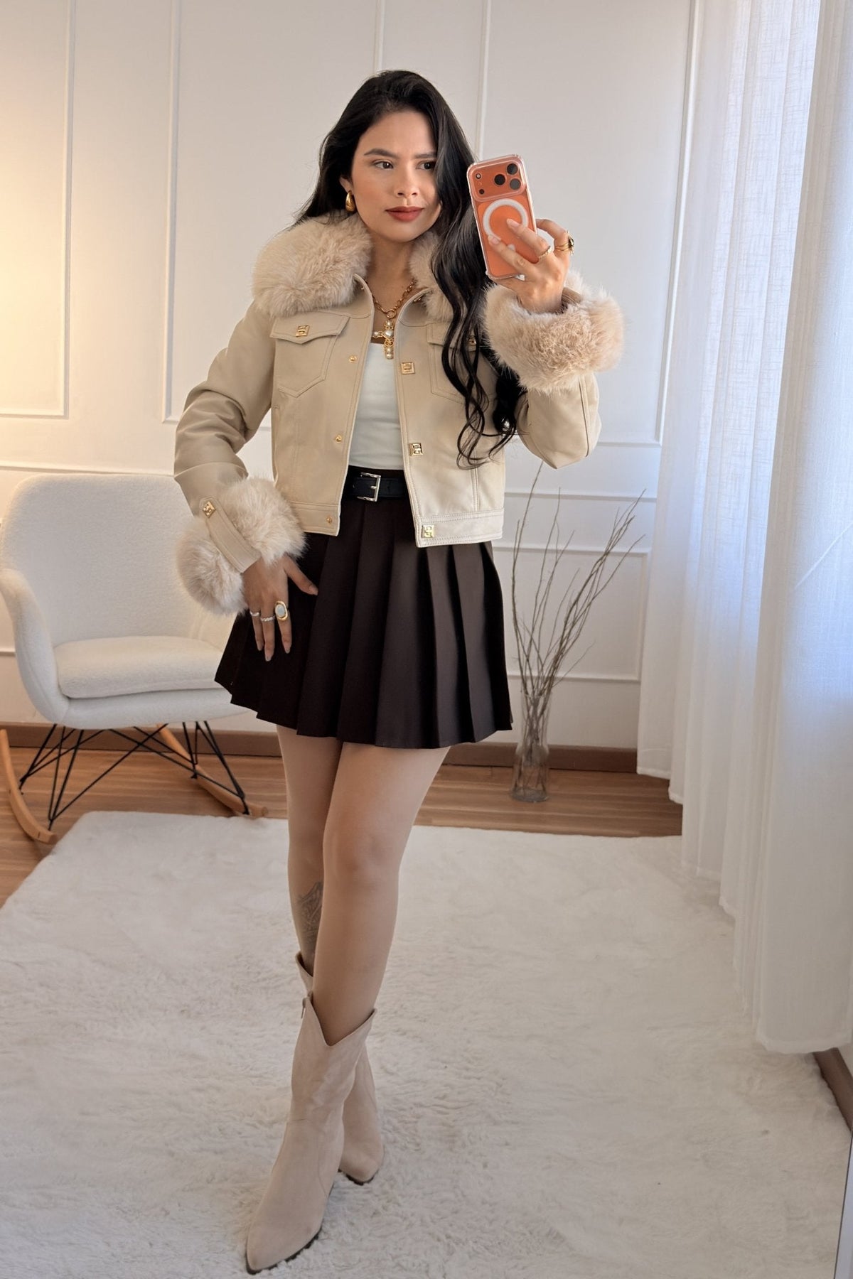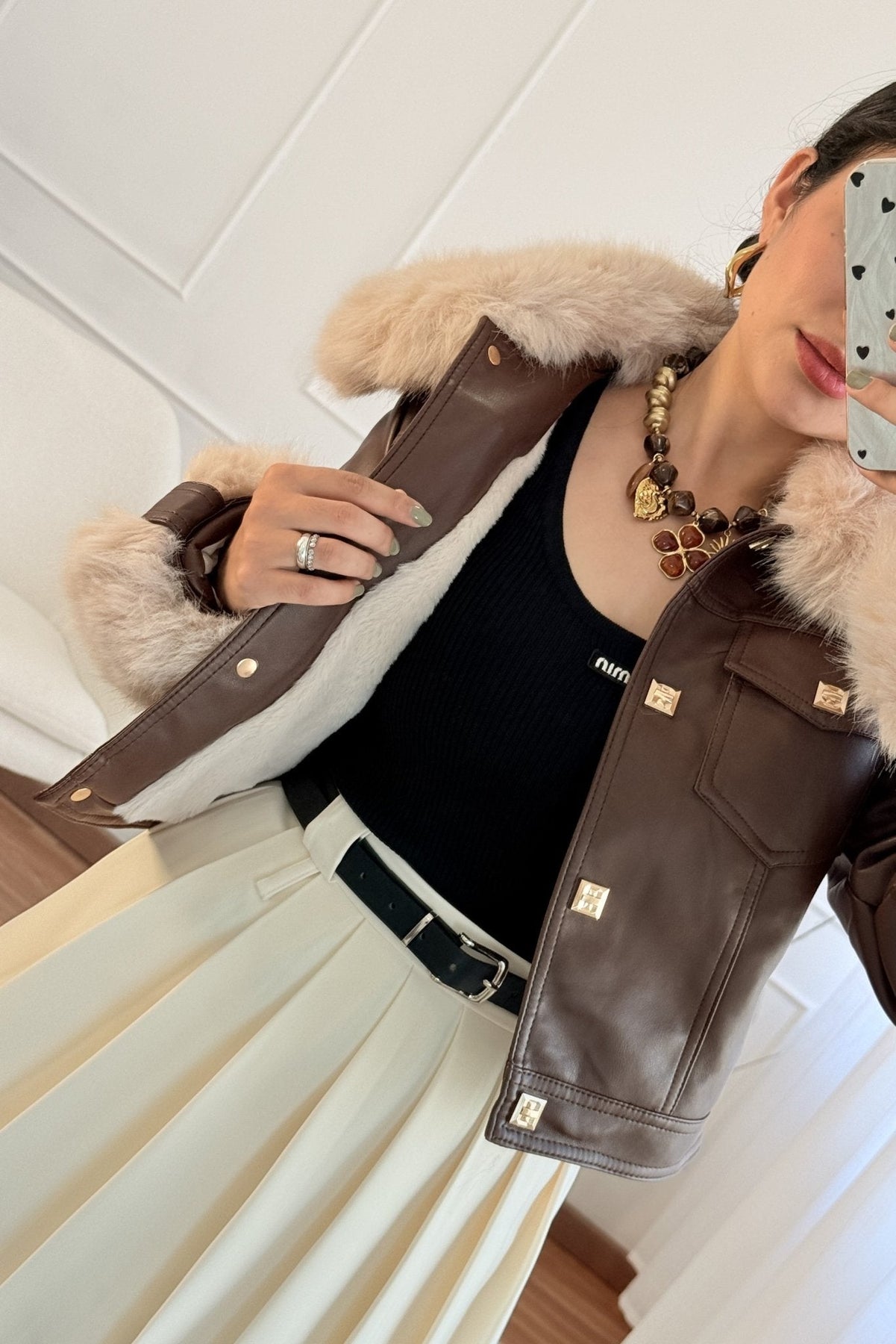 Tento krátký kabát z umělé kůže s páskem spojuje moderní, strukturovaný design s luxusními detaily, které pozvednou každý outfit. Odepínací límec a manžety z jemné kožešiny vám umožní měnit styl podle nálady, zatímco celá vnitřní podšívka z kožešiny poskytuje prémiové teplo a maximální pohodlí nejšchladědne iv tchladní.