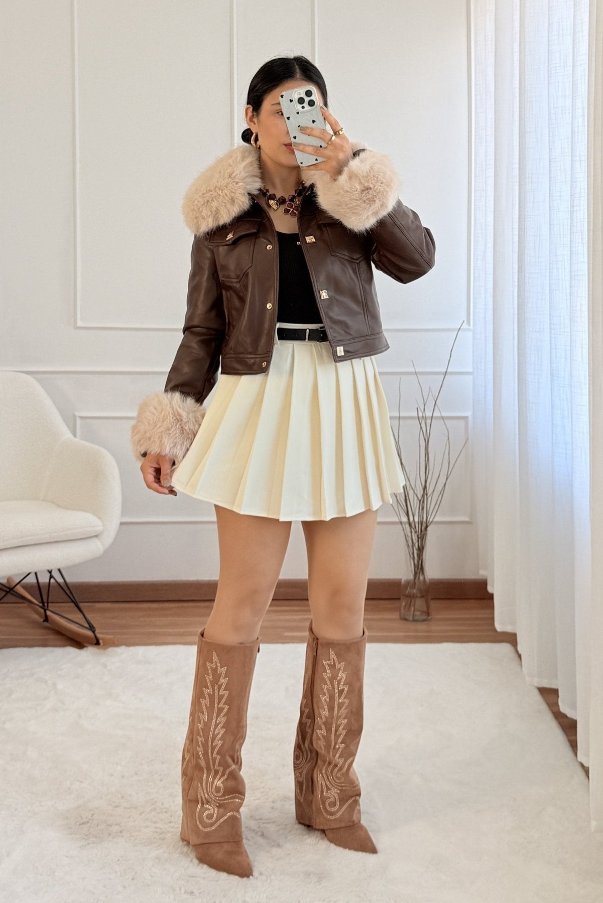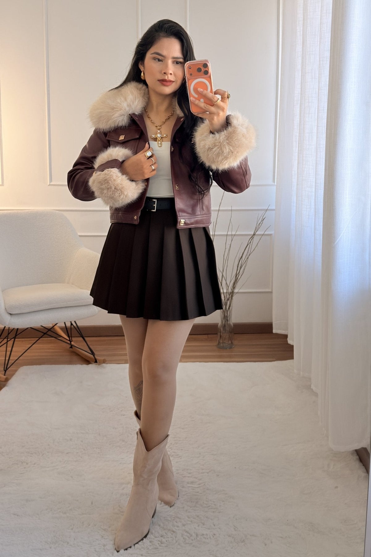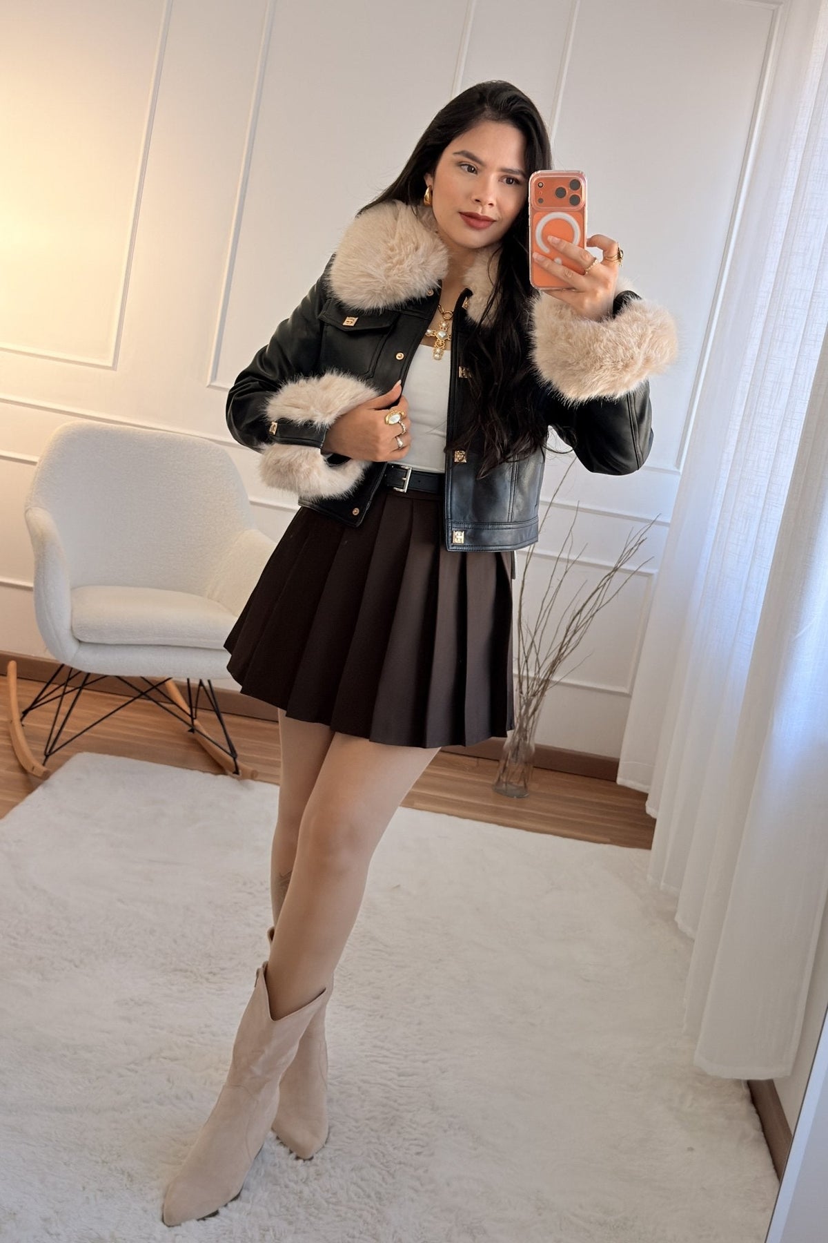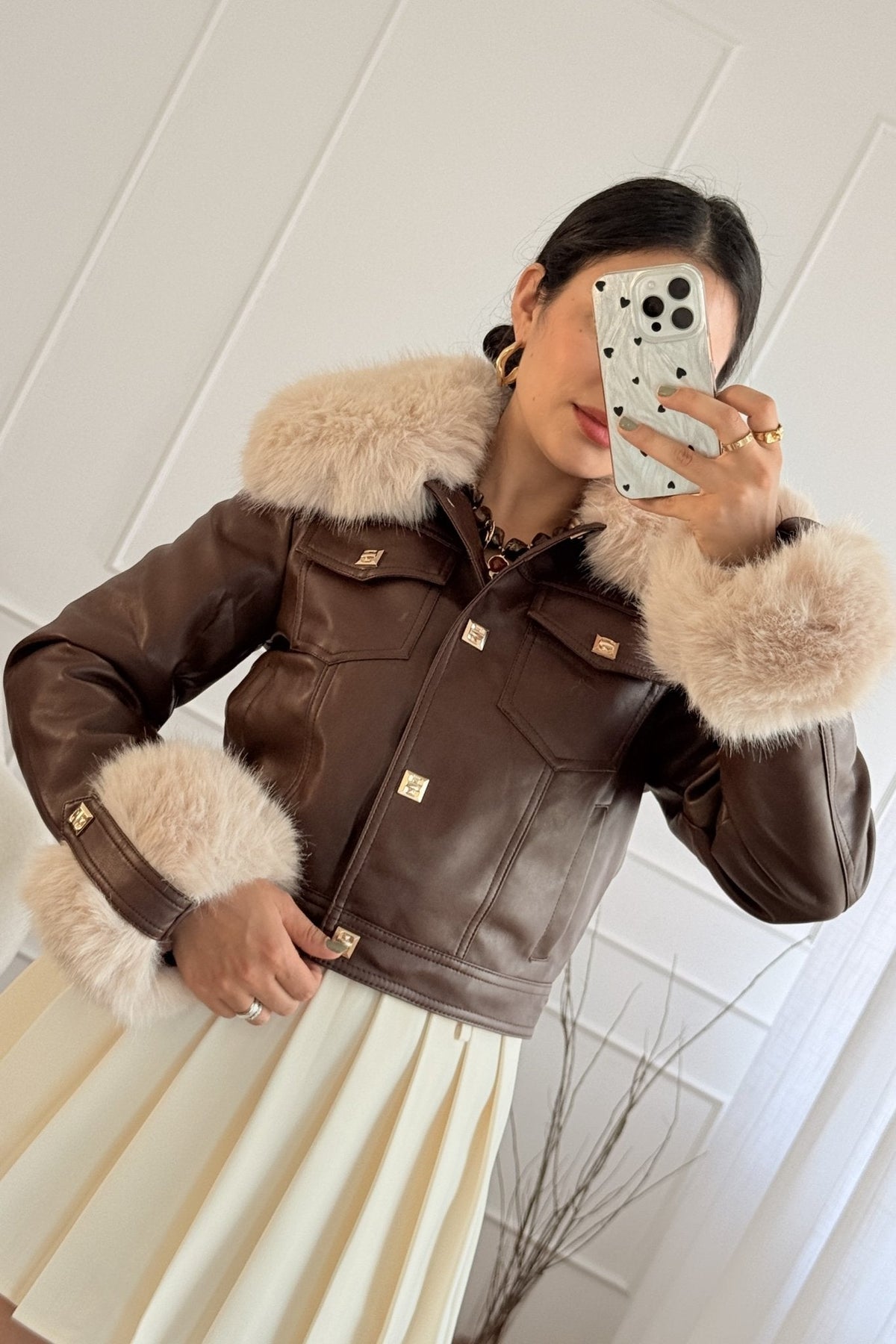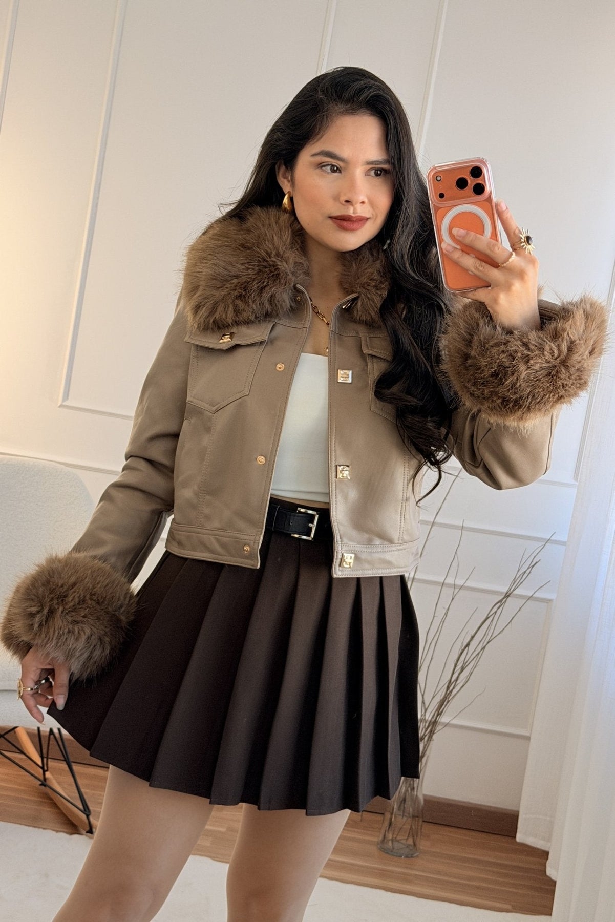 Tento krátký kabát z umělé kůže s páskem spojuje moderní, strukturovaný design s luxusními detaily, které pozvednou každý outfit. Odepínací límec a manžety z jemné kožešiny vám umožní měnit styl podle nálady, zatímco celá vnitřní podšívka z kožešiny poskytuje prémiové teplo a maximální pohodlí nejšchladědne iv tchladní.