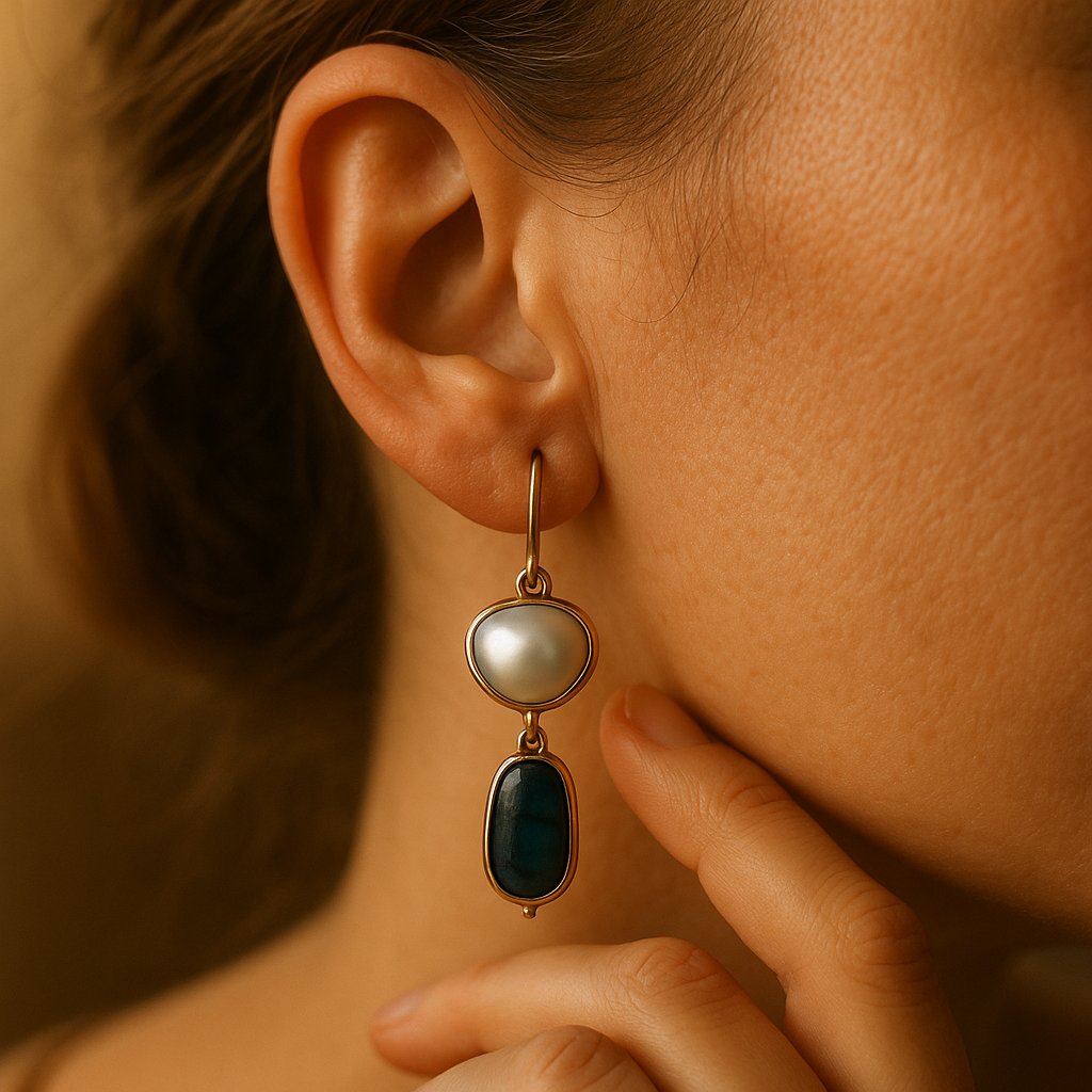 Hluboký modrý kámen připomíná moře při západu slunce, zatímco přírodní perla dodává jemný, měsíční lesk. Tato kombinace evokuje půvab minulých časů a dodává vašemu vzhledu autentický nádech.