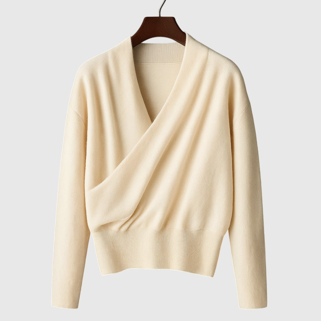 Elegancia, která obejme. Elena je zavinovací svetr s výstřihem do „V“ a krásným splýváním, které opticky prodlužuje postavu a povýší každý outfit – od kanceláře po večeři.