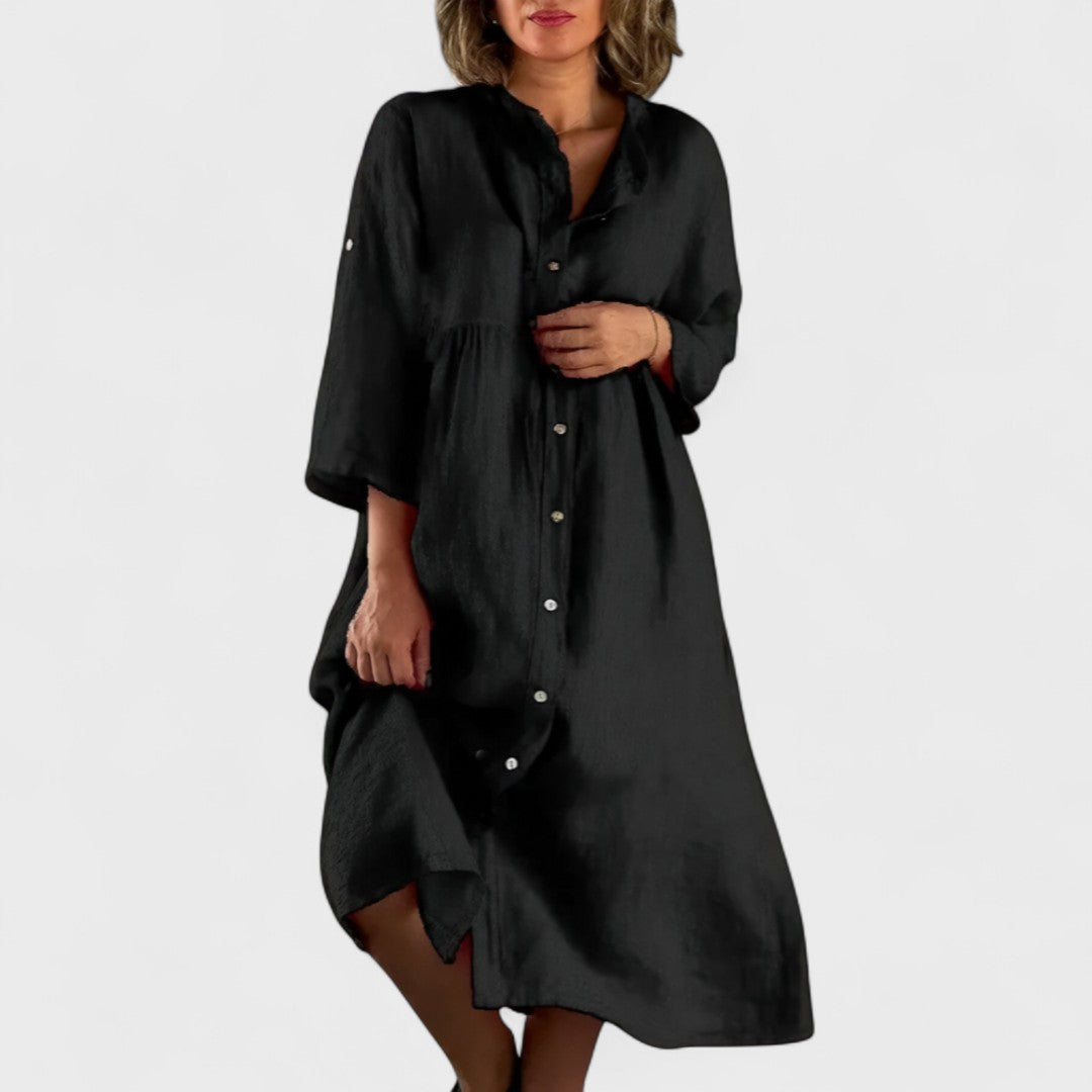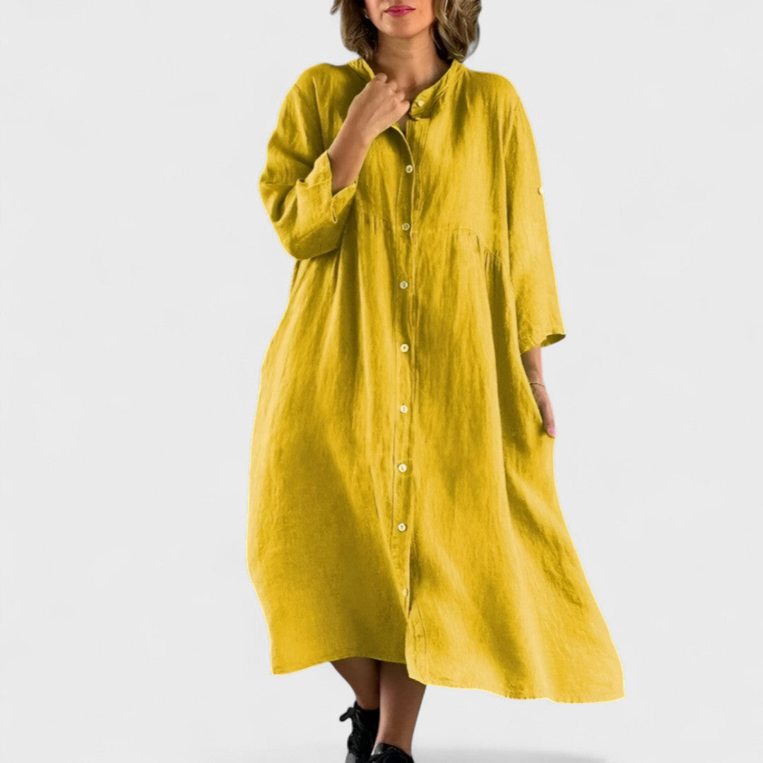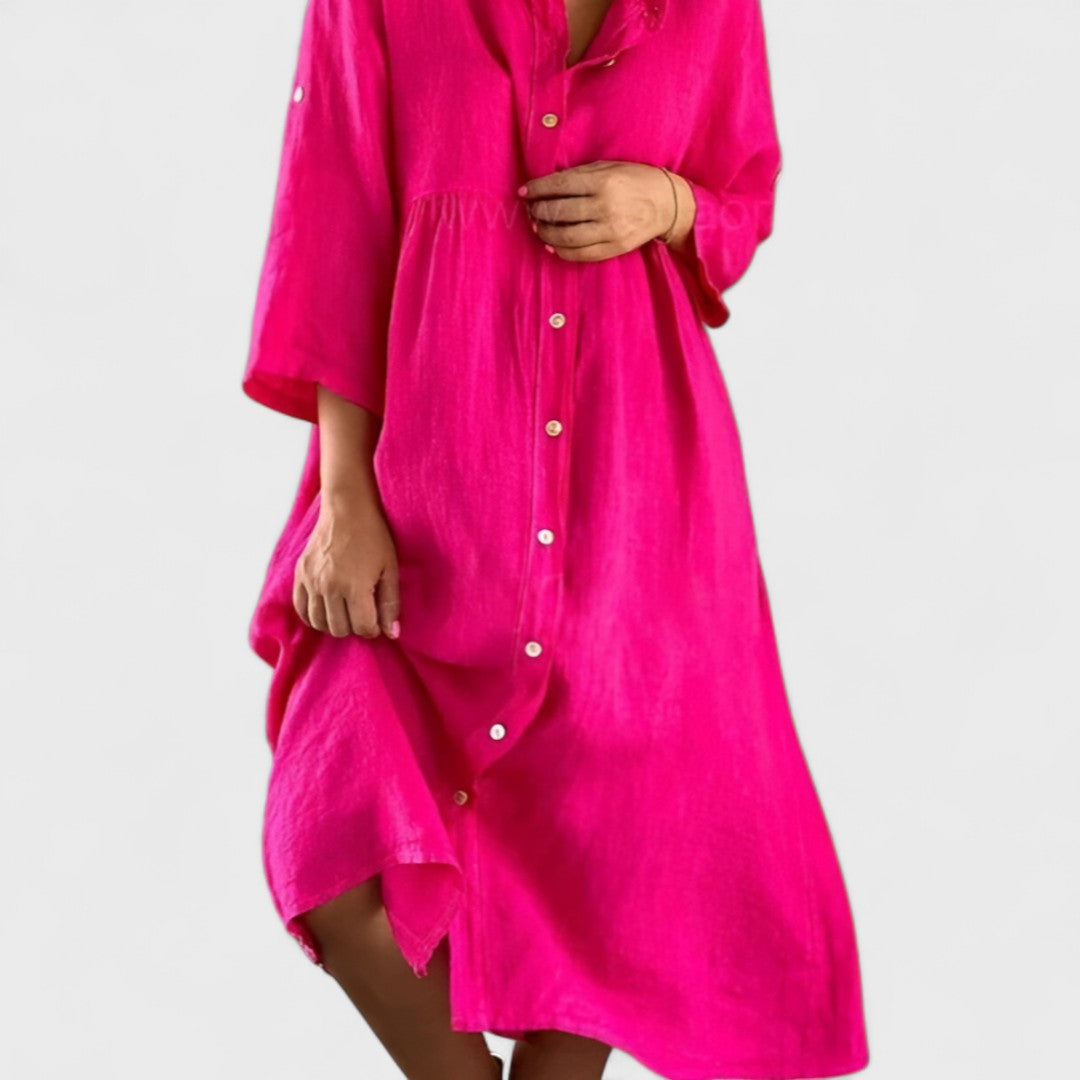 Šaty Isa jsou dokonalým nadčasovým kouskem pro každý den. Jejich vzdušný a příjemný materiál, který kombinuje bavlnu a len, je ideální volbou pro teplé letní dny. Košilový střih s elegantními knoflíky a vázáním v pase vytváří uvolněnou, ale zároveň ženskou siluetu. Jsou perfektní volbou pro procházky po městě, do práce nebo na dovolenou, kde se budete cítit pohodlně a stylově.